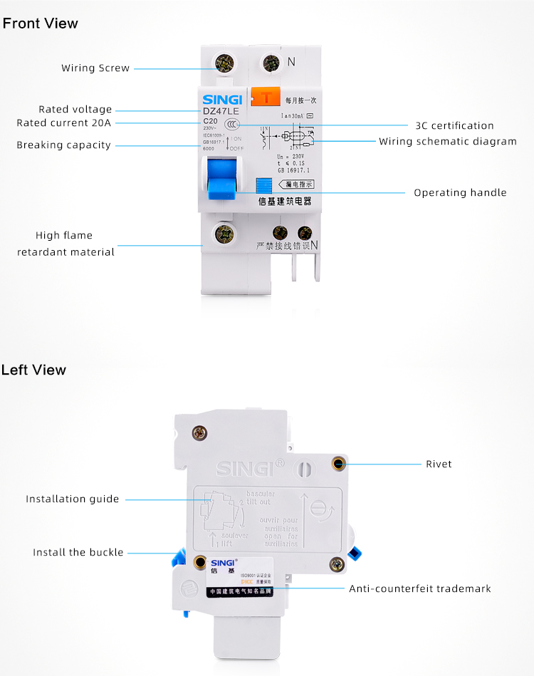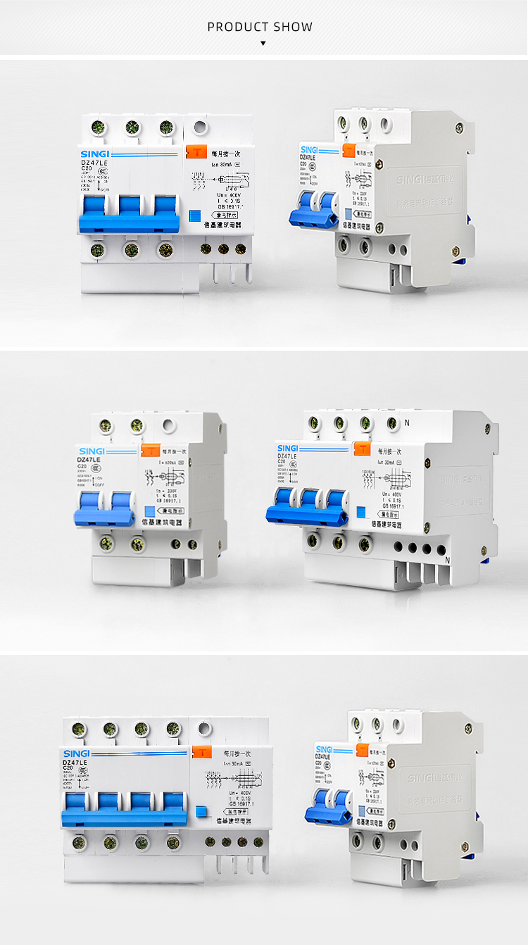 Der Fehlerstromschutzschalter DZ47LE-63 besteht aus einem hochbrechenden Mini-Leistungsschalter DZ47-63 und einem Stromleckauslöser. Der ELCB ist ein aktueller elektronischer Fehlerstromschutzschalter. Zu den Hauptbestandteilen gehören ein Nullstromtransformator, eine elektronische Schalttafel, ein Fehlerstromauslöser und ein Leistungsschalter mit Schutzfunktionen gegen Überlast und Kurzschluss.